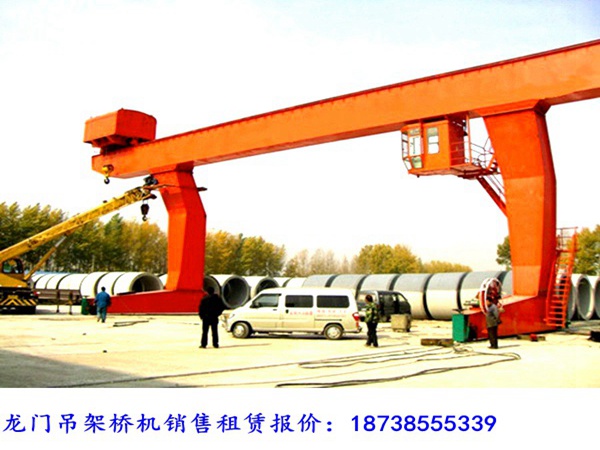 河北唐山龙门吊销售厂家设备的工作原理:龙门吊由起升机构、大车运行机构、小车运行机构、钢结构部分组成,起重机械正常的工作流程为:起升机构接受到操控室发来的指令,起吊动作开始,起升机构先启动,空钩下降,吊起物品上升到一定高度,然后启动小车运行机构和大车运行机构到规定位置后停止。龙门吊是一种大型起重机,横梁和立柱的结构呈“门”字形,所以也叫龙门吊,刻意在轨道上移动,具有较大的起重量。