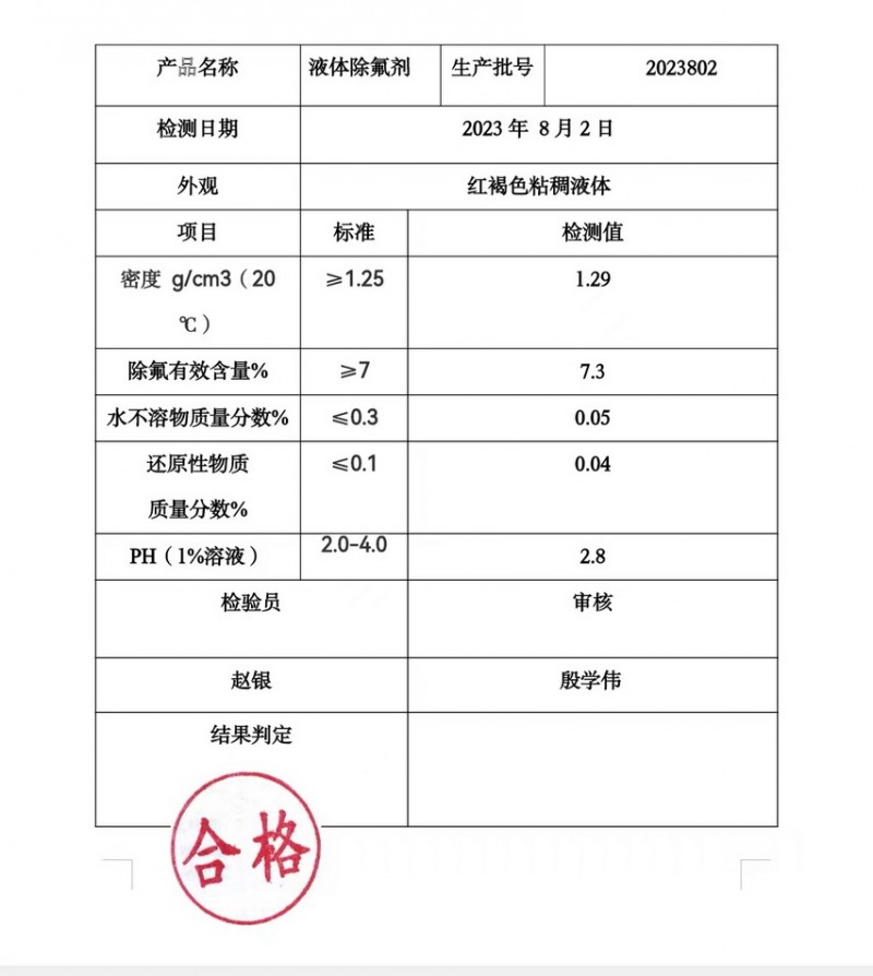 除氟剂属于高分子聚合物,能将水氟离子吸附电和絮凝分离沉淀;在水中同时能去除水中的COD、色度、SS、重金属。具有除氟、混凝、调节PH等多重功效,药剂纯度高、杂质少、较市面上其他产品,用量少、污泥量低、无硬度,长期使用不会造成管道、阀体结垢、堵塞等现象,无需改变原水处理流程,无需增设大型设备,无需复杂调试,反应速度快,操作简单,较市面上其他产品,产品用量少,吨水处理成本低。