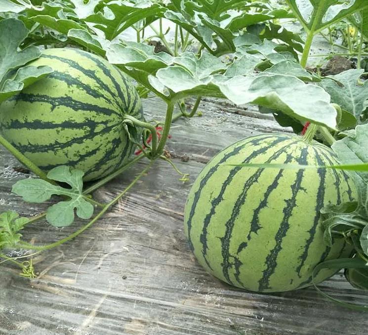 二、美都西瓜苗:中熟杂交种。常温下开花至果实成熟约40天,一般单瓜重5千克以上。果实圆球至高球型。果皮绿色,覆有墨绿条纹。如果实膨大期遇低温,果皮底色和条纹会加深。果肉桃红色,甜而多汁,中心可溶性固形物11~12%,边可溶性固形物8~9%。果皮较84~24略硬,较耐储运。美都西瓜苗,耐低温、坐果性好,抗病丰产,品良,为早春大棚定植品种。
