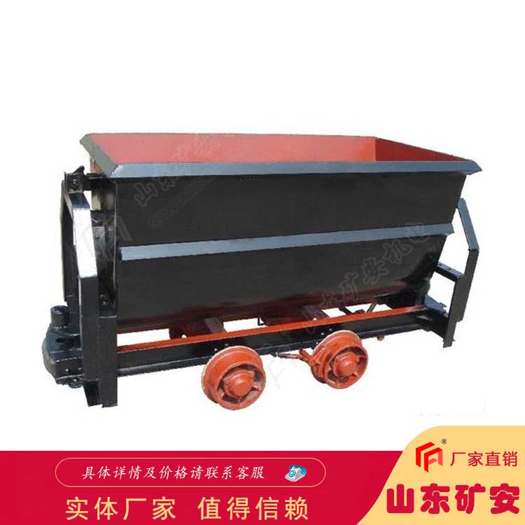 KFV1.1-6型翻斗式矿车使用于矿井、矿山巷道地面矿厂和建筑工地运输矿石、煤炭、沙碎石等物料,一般须用机车或绞车牵引。V 型矿车一般以运输松散密度在1800kg/m3以下的物料为主,多用于地表作业。其基本组成为车箱、车架、连接器和行走机构。车架为一金属结构,能承受牵引力、制动力。连接器是连接机车和矿车的部件。由插销连接环合回转链组成。行走机构由4个车轮和2 根轴组成的两个轮对。Kuangan002