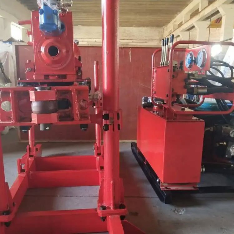该型钻机采用全液压结构主要由泵站、主机、操作台组成。钻机各部分连接的接头全部采用快速联接头,安装撤卸搬运方便;主要使用硬质合金、金刚石复合片钻头回转钻进,同时也可配大口径的螺旋钻杆和取芯钻头,适应不同的钻探要求。