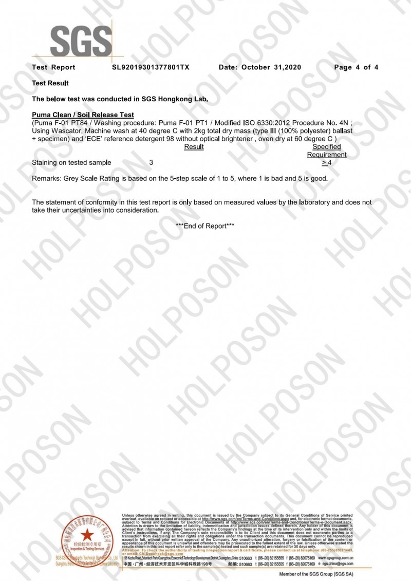 HOLPOSON® Smart Clean 是经过特殊改性聚酯类亲水易去污整理剂,能够赋予加工织物良好的亲水,抗静电,吸湿速干,蓬松等性能,且耐洗性达50次以上(JIS L0217.103法,连续洗涤法)经过易去污整理后的纺织面料,在一定程度上可以清水擦除所沾污渍,如黄油、番茄酱、玉米油,圆珠笔油渍等。满足家庭主妇对浅色衣物易打理易清洁的要求,使难去除的,易残留的脏污,可以去除干净,达到污所不落,节能去污,本产品适用于天然纤维素纤维及其混纺织物,目前可做用于浅色系列的童装面料、羽绒服面料、沙发面料、工装、职业装、白T恤等.