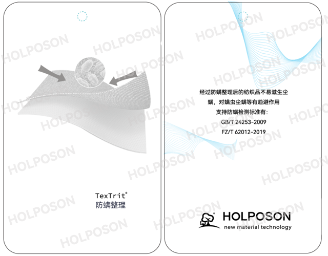 HOLPOSON® Black Widow Mite也叫黑寡妇®,是有机菊酯类高分子抗菌防螨整理剂,适用于几乎所有类型的纤维,如:棉,粘胶,涤纶,尼龙等天然、合成纤维及混纺织物。即可应用在针织物、梭织物、家纺产品、装饰用布等纺织品。本产品可以抑制以下细菌:大肠杆菌、白色念珠菌等,有效防止螨虫的生长、繁殖,赋予纺织品抗菌防螨功能