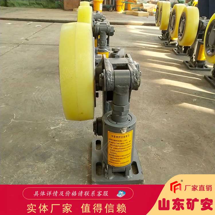 在提升容器上时,应根据罐道安装精度(竖直度)和本系列产品的缓冲行程合理确定聚氨脂轮与罐道的贴紧程度,贴紧程度的过大与过小会造成提升容器的大幅度摆动,引起提升容器的铁罐耳与罐道的碰撞。若罐道安装精度符合标准,聚氨脂轮与罐道的zui低点贴紧即可。
