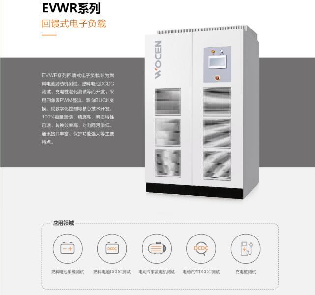 回馈式直流电子负载产品简介:EVWR系列回馈式直流电子负载采用四象限PWM整流、双向BUCK变换、纯数字化控制等核心技术开发,具有能量双向流动、100%能量回馈、精度高、瞬态特性迅速、转换效率高、对电网污染低、通讯接口丰富、保护功能强大等主要特点。