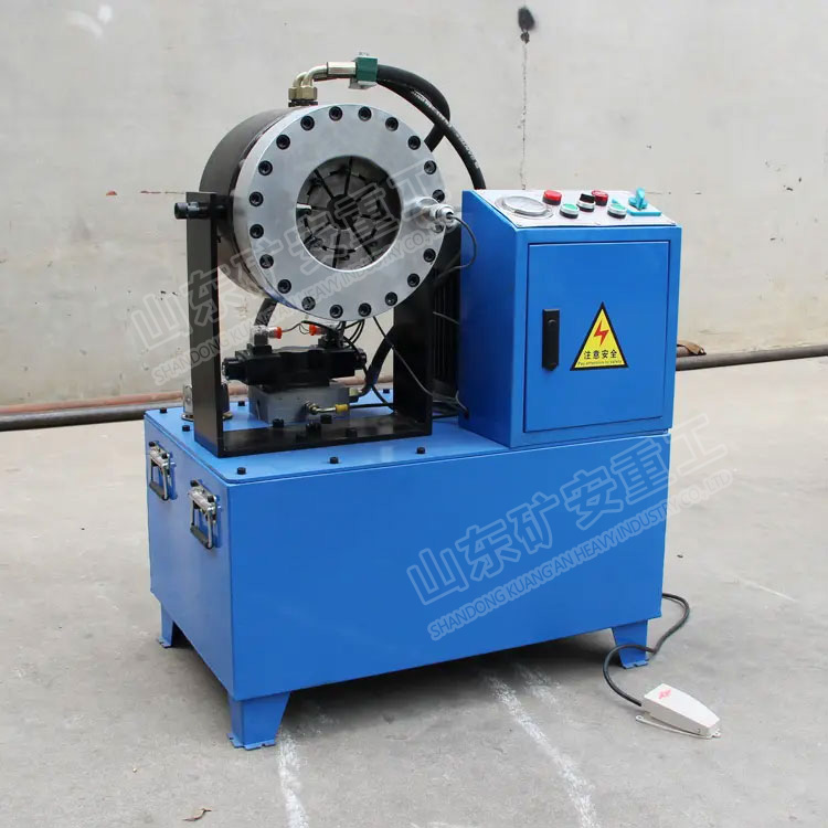 油泵安装于油箱内浸泡在液压油里达到科学散热静音的设计目的,油泵在电机驱动下,输出液压油,推动扣压油缸内的柱塞运动,致使模座径向收缩,实现模具对胶管接头外套的挤压。当收缩量达到千分尺预定值时,挤压自动停止,电磁换向阀换向后,油缸内的柱塞反向运动,模具随之张开,扣压胶管完成。Kuangan002
