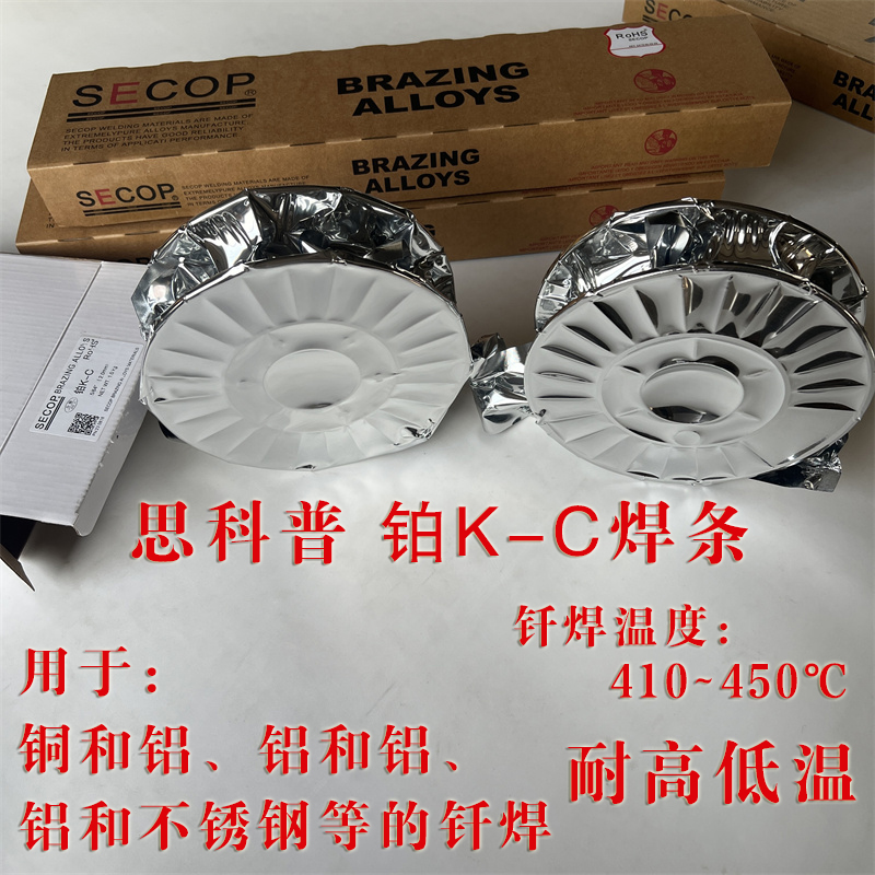 SECOP新研制的铜铝异种金属钎焊用药芯钎料铂K-C。该钎料焊接温度420℃~490℃,操作方便,可使用火焰钎焊进行焊接,不需另外添加钎剂,焊接接头强度高,密封性好,能钎焊铝—铝、铜—铝、铝—不锈钢及铁合金。是制冷空调冰箱、电机、变压器等行业实现铝代铜的理想焊接材料,具有节约资源、能源、等许多优点,能给用户带来的经济效益和社会效益。铜铝药芯钎料,以SECOP生产的SECOP铂K-C铜铝药芯焊丝和SECOP铂K-A铝铝药芯焊丝两种。