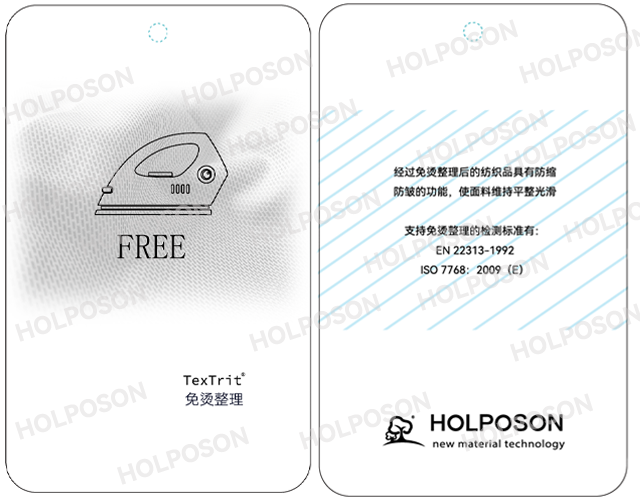 HOLPOSON® Ironing Free 树脂是纤维素纤维及其混纺织物洗可穿免烫整理的无甲醛整理剂,主要应用于以衬衫、职业装、帽子为主的服装面料的防皱整理,赋予面料良好的防皱免烫性能,穿着时不受拘束,不易起皱,手感柔软。