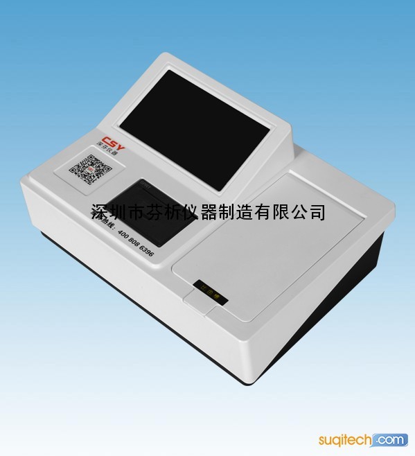 深圳市芬析仪器制造有限公司生产的CSY-GF全光谱食品安全综合检测仪可同时快速对多个样品进行全光谱扫描检测,样品检测时间不超过10秒;能准确、快速检测出食品色素(柠檬黄、日落黄、胭脂红、苋菜红、诱惑红、亮蓝、赤藓红)、病害肉(组胺检测、挥发性盐基氮含量、肉类细菌毒素)、重金属(铅、汞、铬、 砷、镉)、蛋白质、粗蛋白、茶多酚、甜蜜素、安赛蜜、吊白块、淀粉含量、二氧化硫、二氧化氯、过氧化氢(双氧水)、过氧化值、食用油酸价、食品甲醛、酱油氨基酸态氮、酱油中食盐、酱油中铁强化剂、酱油总酸、食醋总酸、食盐碘、蜂蜜水分、蜂蜜酸度、蜂蜜中果糖葡萄糖、羟甲基糠醛、饴糖、蔗糖、硼砂、亚硝酸盐、亚硫酸盐、亚铁氰化钾、硝酸盐、工业火碱(氢氧化钠)、过氧化苯甲酰、面粉中溴酸钾、面中铝、明矾、苯甲酸钠、焦磷酸二氢钠、硫氰酸钠、山梨酸含量、山梨酸钾、苯甲酸钠、木耳硫酸镁、粮食新鲜度、味精谷氨酸钠含量、味精硫化钠、葡萄酒中铁含量、真假葡萄酒、糖精钠、芝麻油纯度、甲醇含量、乙醇、碱性橙II、脂肪含量、猪油中丙二醛含量、三甲胺、苏丹红、罗丹明B、食品中孔雀石绿中的含量;以及其他食品安全有毒有害物质项目进行快速检测。可广泛应用于各级政府蔬菜检测中心、农贸市场、超市、环保机构、蔬菜种植基地、饭店、车载及实验室等食品安全检测与监控场所等单位。全光谱食品安全综合检测仪技术参数: