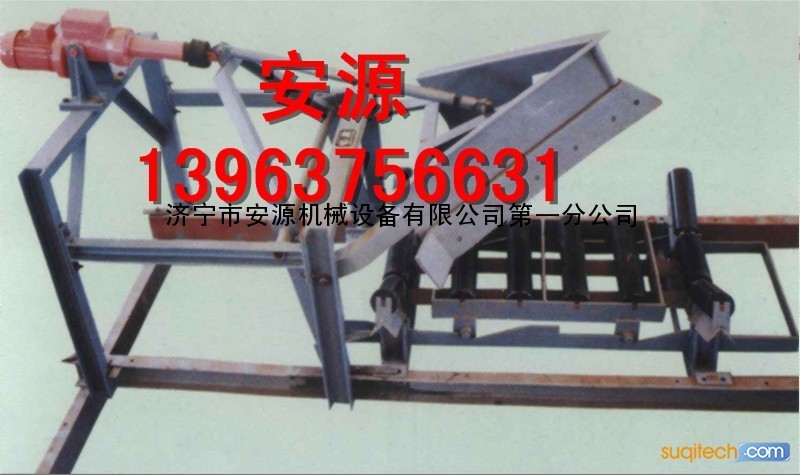 电液动犁式卸料器以电动液压推杆为动力源,工作时,通过推杆伸出作用于驱动杆, 带动框架前进,完成犁刀下落,并支承起平托辊组,使胶带工作面平直,犁刀下沿与胶带面贴合紧密,将运行胶带上的物料卸入漏斗(料斗)中,或卸到需要的场所去。卸料完毕时,启动推杆缩回作用于驱动杆, 带动框架后退,犁刀上抬,可变槽角托辊组由平形变回槽形,使胶带工作面恢复槽形状态,让物料平稳通过;由于电动液压推杆采用液压传动,具有自动过载保护性能。当运行受阻时,油路中压力增高到调定的限额,溢流装置迅速而准确地溢流,实行过载保护。电机运转在额定值内,不会烧毁。