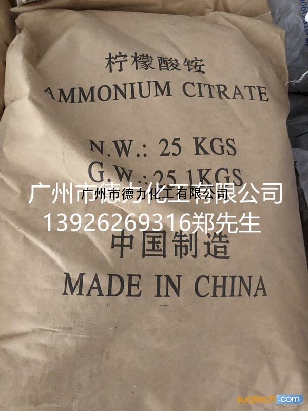 柠檬酸铵电镀工业用作无氰电镀络合剂。机械工业用于配制防锈剂。分析化学中用作化学试剂,测定磷酸盐及化肥中有效磷酸。此外柠檬酸铵也可作为螯合剂处理河流底泥种的重金属,如砷,铬等。
