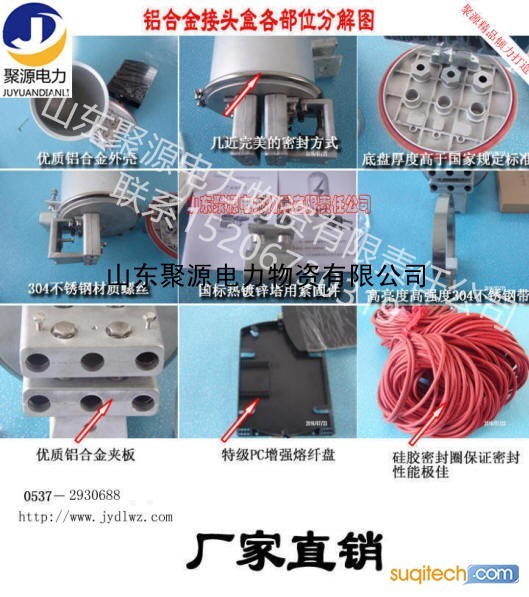 由“山东聚源电力物质有限责任公司”生产的新型改进型卡箍固定铝合金接头盒,解决了原来产品紧固过程中出现的漏气,密封不严的弊端,几近完美的密封方法,更具有防腐、防水、防尘、抗冲击、寿命长、价格优。安装使用方便等优点,是接续盒更新换代和施工单位光缆线路安装施工的选,欢迎新老客户选购!