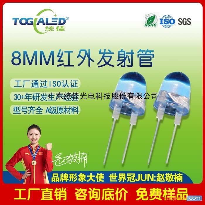 8MM头0.5W红外线发射管采用台湾鼎元芯片,质量有保障。由于红外光波长的范围相当宽,故红外发发射管必须与红外接收管配对使用,否则将影响的灵敏度,甚至造成失控。因此在代换选型时,要务必关注其所辐射红外光信号的波长参数。