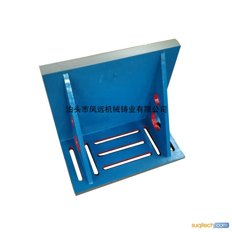 按 GB6092- 85 标准制造 , 材料 HT200-250. 用于零部件的检测和机械加工中的装夹。用于检验工件的 90° 角,维修设备时检验零部件相关表面的相互垂直度,还常用于钳工划线。并可常用于检验、安装、机床机械的垂直面检查,并能在铸铁平板上检查工件的垂直度。注意事项: 铸铁T型槽弯板不要在潮湿、有腐蚀、过高和过低的温度环境下使用和存放。在使用时要将铸铁弯板的安装调试,然后,把铸铁弯板的工作面擦拭干净,在确认没有问题的情况下使用铸铁弯板。