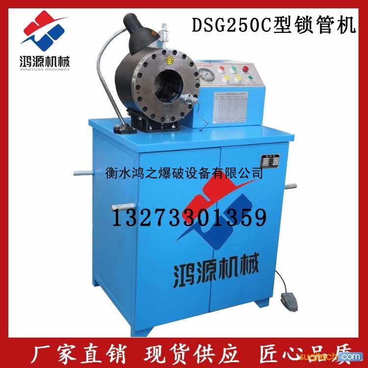 DSG-250C型锁管机适用于工农业和工程机械液压传动用高压胶管、纤维管、塑料管总成的扣压加工。具有体积小、重量轻、功能多、开模快、易操作、好维修等优点。