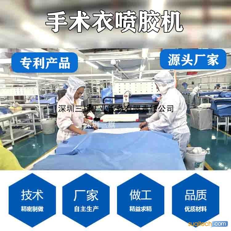 三旗智能喷胶机针对无纺布手术防护衣 袖口 PPT 铺单等各部位粘合,采用环保水性胶 高精密均匀喷胶效果符合防护衣标注 应用于无纺布材料上粘复合。