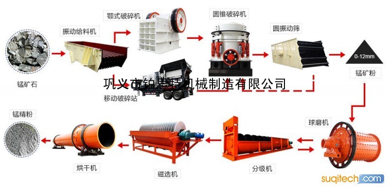 我国锰矿绝大多数属于贫矿,必须进行选矿处理。但由于多数锰矿石属细粒或微细粒嵌布,并有相当数量的高磷矿、高铁矿和共(伴)生有益金属,因此给选矿加工带来很大难度。目前,常用的锰矿选矿方法为机械选(包括洗矿、筛分、重选、强磁选和浮选),以及火法富集、化学选矿法等。