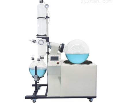 蒸发瓶恒速旋转,水浴锅恒温加热,在此条件下:物料在蒸发瓶内壁形成大面积均匀薄膜快速蒸发,在真空条件下可以提高蒸发效率(需连接真空装置),溶媒蒸汽经玻璃冷凝盘管时冷却成液体(需连接冷却装置),回收于收集瓶。