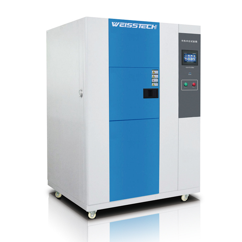 两箱式:在进行高低温冲击试验时测试篮是移动的,主要是靠测试篮在高温区和低温区中上下移动来完成高低温冲击转换,两箱式比三箱式的冲击回复时间更短。